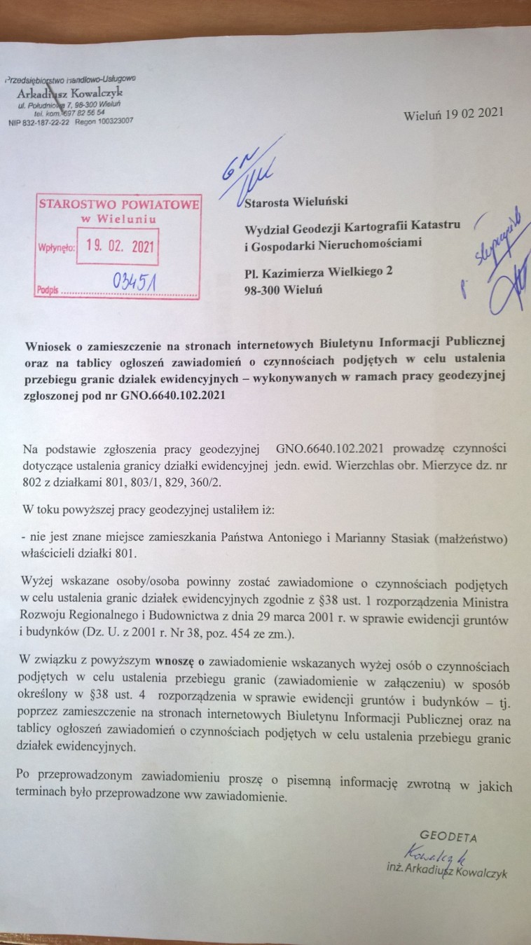 Zawiadomienie Starosty Wieluńskiego z dnia 29 stycznia 2021 r. - przedłużenie postępowania administracyjnego ws sposobu korzystania z nieruchomości dz. 419/4 o pow. 1,8386 ha, obręb Gromadzice, gmina Czarnożyły