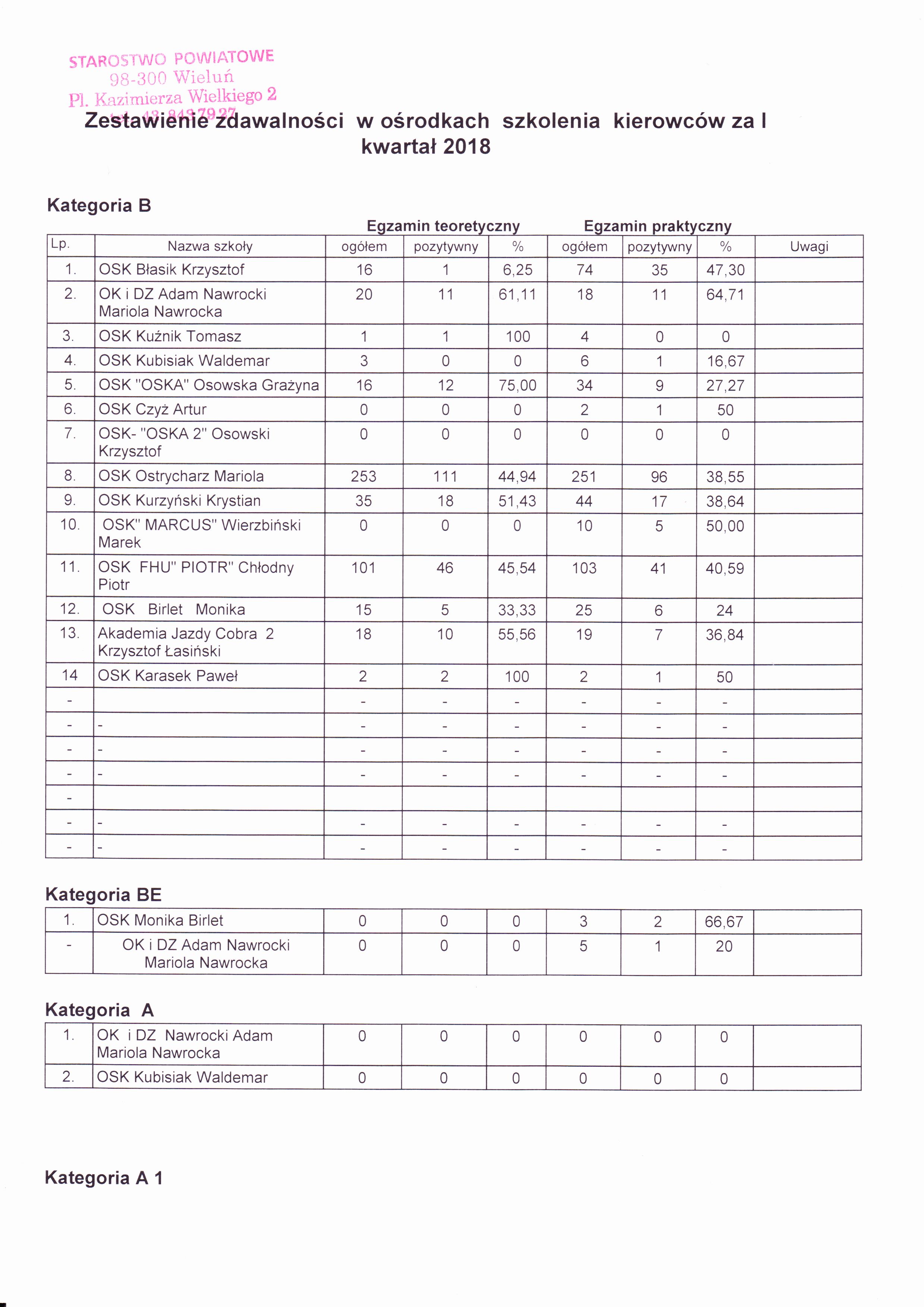 Zestawienie zdawalności w Ośrodkach Szkolenia Kierowców za I kwartał 2018