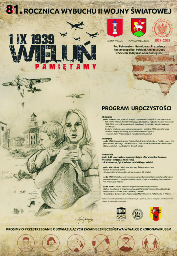 Główne uroczystości obchodów 81. rocznicy wybuchu II wojny światowej w Wieluniu.odbędą się na ul. Królewskiej / Pl. Kazimierza Wielgiego w Wieluniun w dniu 1 września 2020 r. o godzinie 4:40
