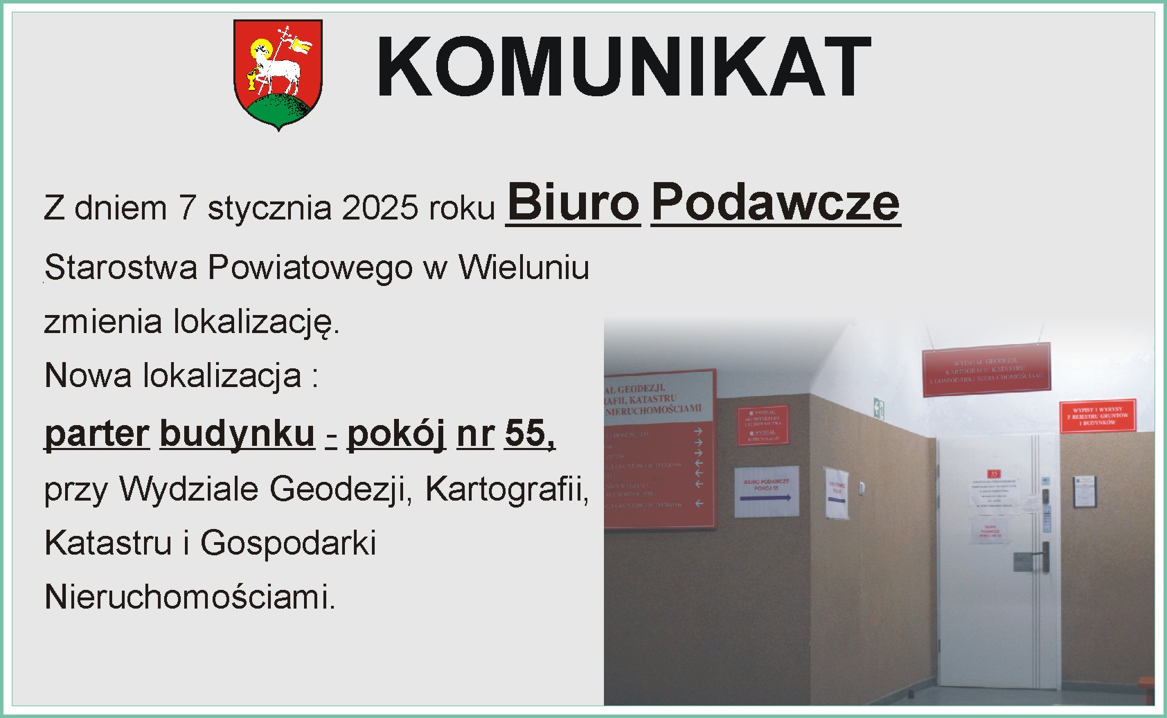 Z dniem 7 stycznia 2025 roku Biuro Podawcze Starostwa Powiatowego w Wieluniu zmienia lokalizację.